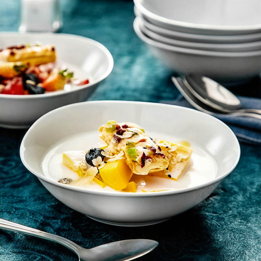 Designed for relaxed entertaining and everyday meals, these porcelain snack bowls are the perfect addition to any table. Ideal for serving everything from cocktail nuts, olives, and gummy bears to pesto sauce and ice cream toppings. The classic white color shows off your food beautifully – and is great for mixing and matching with other dinnerware and serving pieces.